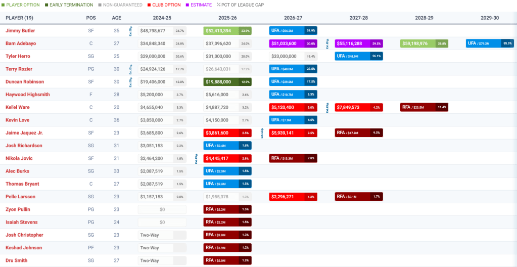 Der Vertrag von Jimmy Butler wurde laut Aussagen der Franchise in beiderseitigem Einvernehmen vorerst so belassen. Er ist im letzten Vertragsjahr mit einer Spieleroption für 25/26 in Höhe von $52 Millionen.