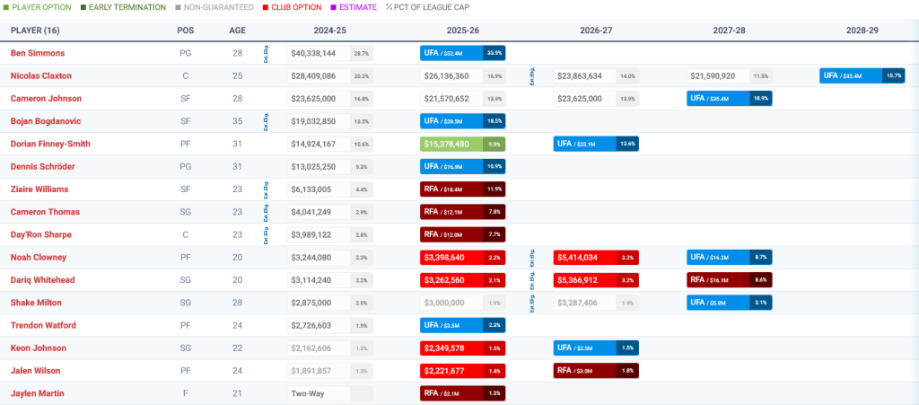 Dafür sprechen auch genug auslaufende Verträge: Schröder ($13 Millionen), Bogdanovic ($19 Millionen), DFS ($15 Millionen) und ja, genau die $40 Millionen von Ben Simmons – richtig, den gibt es auch noch. Ich möchte nicht viel zu Ben sagen. Man weiß einfach nicht, was man bekommt: Ob er spielt, wie er spielt, ob sein Rücken schmerzt oder sein Kopf nicht in Ordnung ist. Das wichtigste: Er hat nur noch ein Jahr Vertrag. Trotzdem wünsche ich mir persönlich einen fitten Ben Simmons.