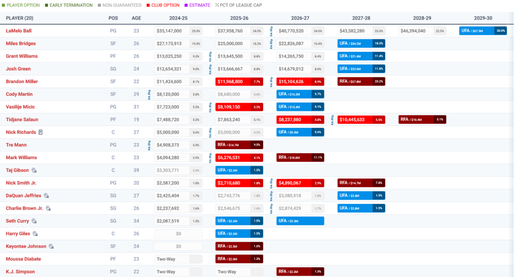 Taj Gibson, Moussa Diabate und Keyontae Johnson waren weitere Verpflichtungen der Hornets. Im NBA-Draft 2024 entschieden sich die Hornets an Position sechs für Tidjane Salaün. Trotz seiner athletischen Fähigkeiten und seiner defensive Präsenz gilt der 2.06m große Forward aus Frankreich als Upside-Pick. Er bringt zweifelsohne großes Potential mit, benötigt jedoch sicherlich einiges an Entwicklungszeit (insbesondere in den Punkten Konstanz und Wurfqualität), um für die Hornets erfolgreich zu sein. Mit KJ Simpson, den die Hornets an Position 42 auswählten, kommt ein junger Point-Guard von der University of Colorado nach Charlotte, der von einigen Experten auch eine First-Round Grade bekommen hatte. Spielintelligenz, Dynamik und ein positiver Charakter machten den 1.88m großen Simpson für Charlotte als Entwicklungsspieler interessant. Simpson unterschrieb einen Two-Way-Contract.