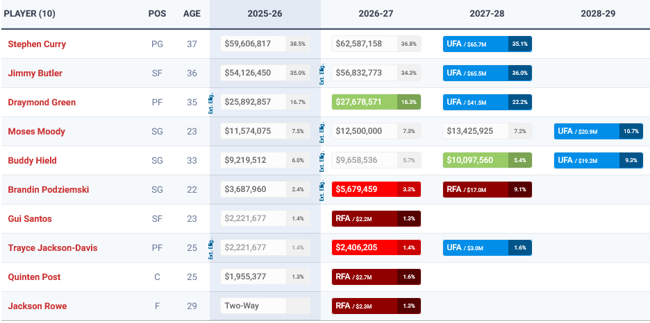 Eine Bewertung des Kaders ist somit schwierig bis unmöglich. Zum jetzigen Zeitpunkt ist zu konstatieren, dass Golden State für die kommende Saison wohl mit einem sehr alten Kader ins Rennen gehen wird, auch wenn mit Brandin Podziemski (22), Trayce Jackson-Davis (25), Quinten Post (25) oder Moses Moody (23) talentierte Jungprofis bereitstehen. Der Titel ist trotz aller Ungewissheiten das klar erklärte Ziel von Curry (37), Butler (36), Draymond Green (35) und Co. – weiterhin die Schlüsselspieler dieser Warriors.