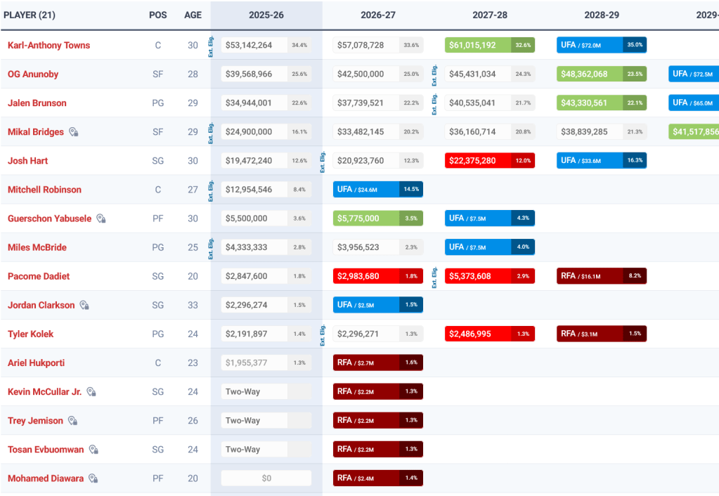Für den ganz großen Wurf reichte es zwar noch nicht aber in New York scheint man davon überzeugt zu sein, dass man mit Jalen Brunson, Mikal Bridges, Josh Hart, OG Anunoby und Karl-Anthony Towns jene Akteure gefunden hat, mit denen man künftig auch in die NBA-Finals vorstoßen kann. Alle genannten Spieler besitzen noch für die nächsten beiden Jahre garantierte Verträge. Einzig die qualitativ dünn besetzte Bank, die ligaweit bei der „Bench production“ zu den schlechtesten fünf gehört, und die arg auf Brunson zugeschnittene Offensive ließ schon in der vergangenen Saison Zweifel daran aufkommen, ob man sich in der Konstellation im Osten tatsächlich durchsetzen kann.